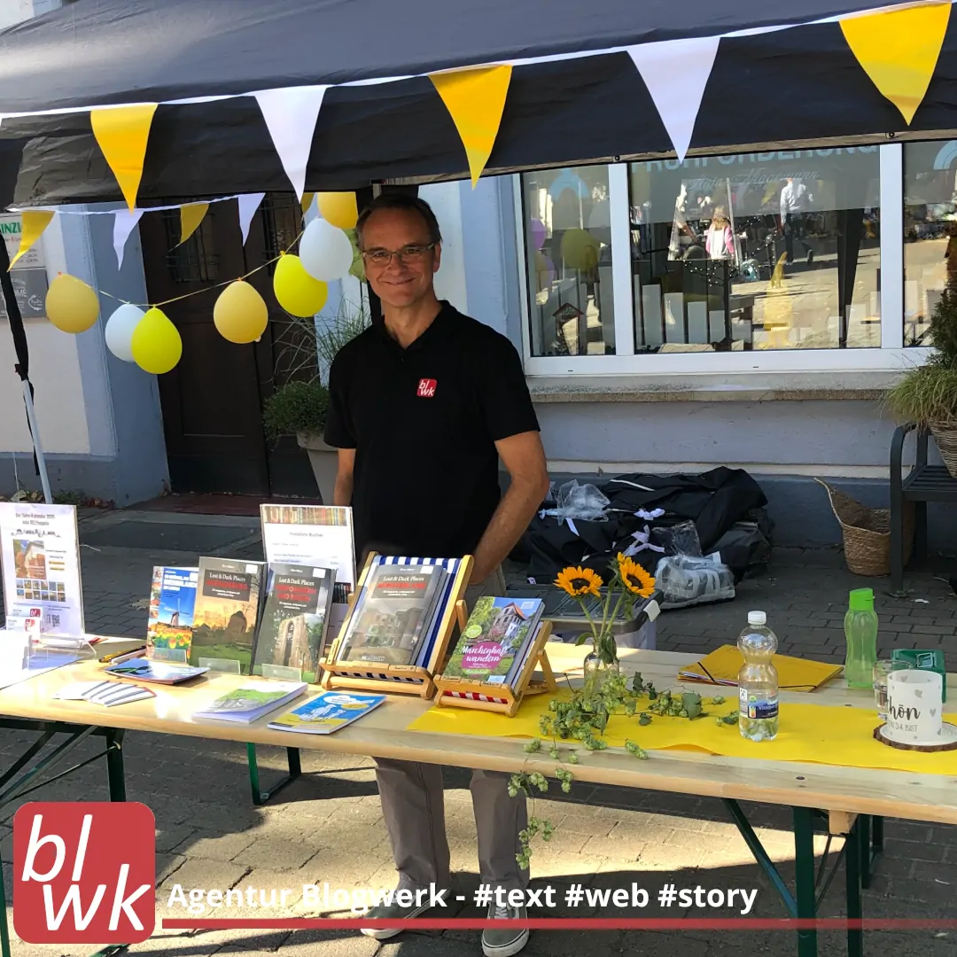 Auf dem Herbstfest „Septemberträume“ in der Altstadt von Selm durfte ich das Blogwerk und meine Büchern präsentieren. Ich stelle mal wieder erstaunt fest, dass es schon einige sind. Es gab viele interessante Gespräche und einige Bücher konnte ich verkaufen. Mehr Info zur Webagentur Blogwerk gibt es hier und meine Bücher dort.